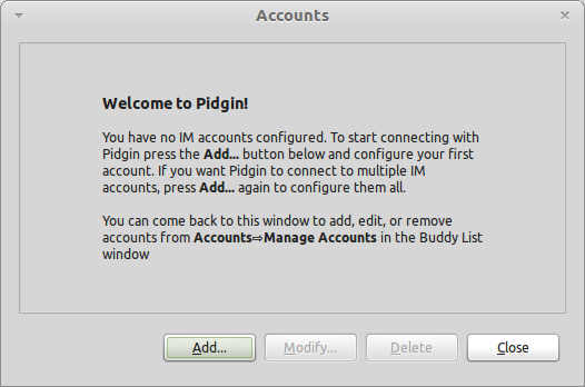 Once installed, open Pidgin. Click on Accounts=>Manage Accounts and then click on Add.
